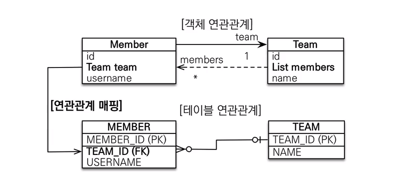 - Team이 Members를 가지는데, Member 입장에서는 Team을 참조하지 않아도 된다라는 설계가 나올 수 있다. 객체 입장에서 생각하면 충분히 나올 수 있는 설계이다.